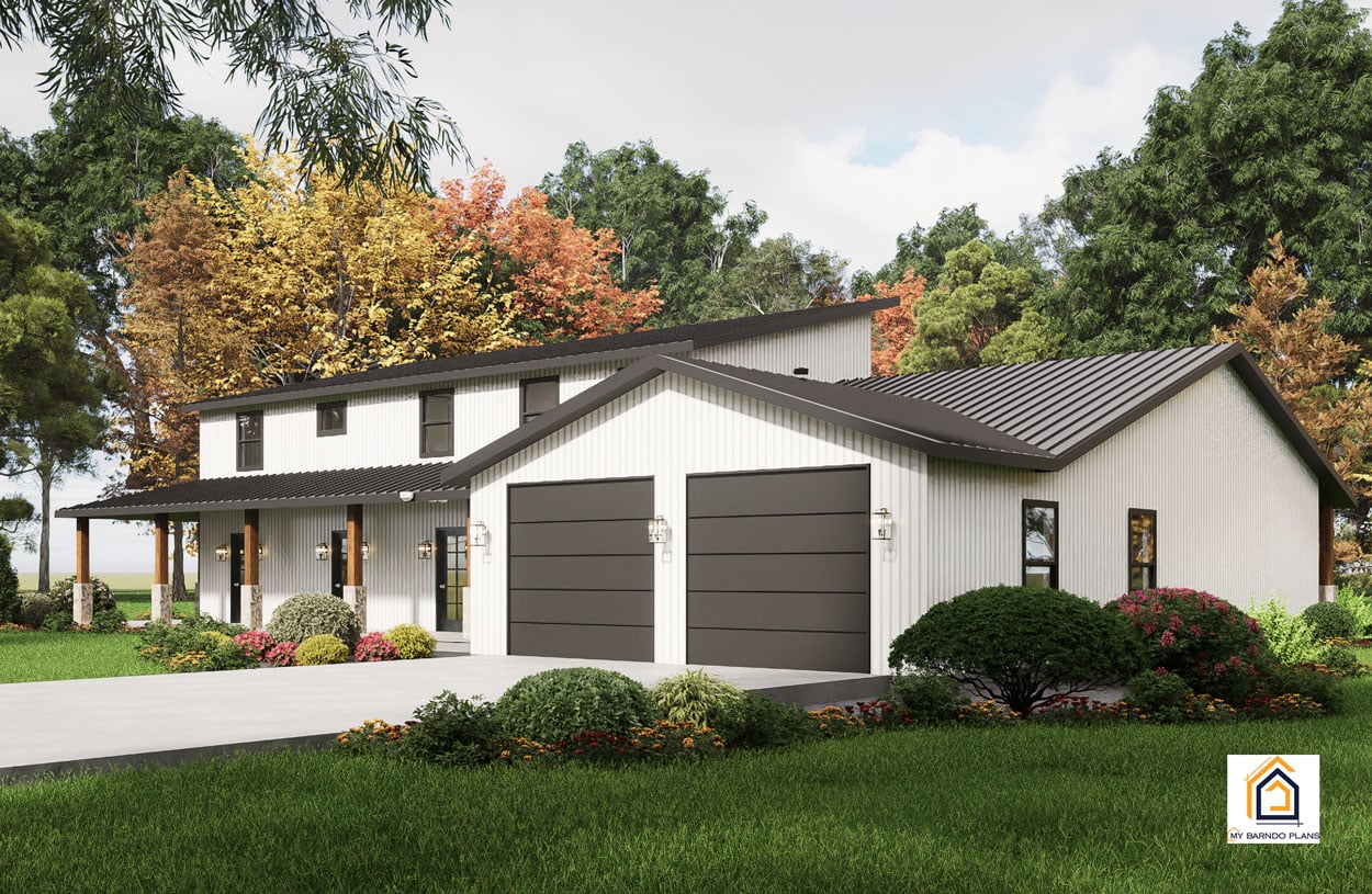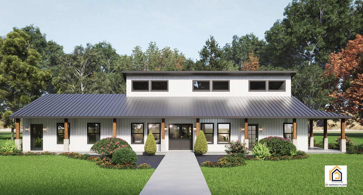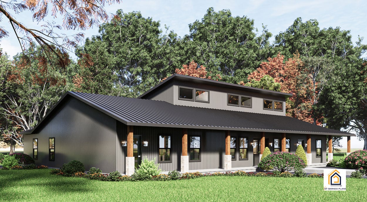 A new dawn awaits with the Sunrise, a barndominium plan that merges old-school comfort with next-generation sustainability. Spanning 2,550 square feet (excluding the garage) and featuring five bedrooms, this design brings together classic country charm and modern innovations—no compromises necessary.