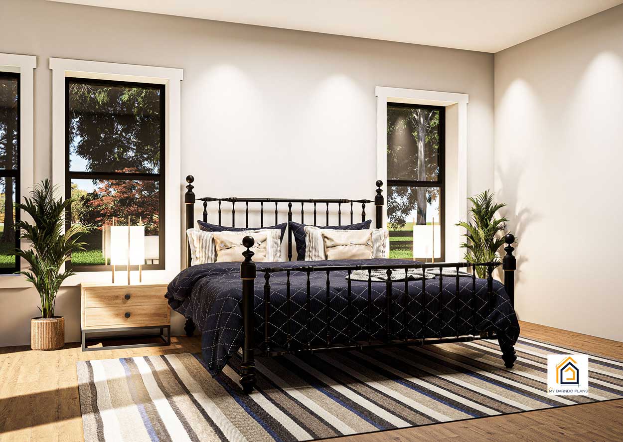 The master suite in the Table Rock Barndominium is located on the main floor for privacy and convenience. The bedroom is large enough to accommodate a king bed and additional furniture while still maintaining a comfortable layout.