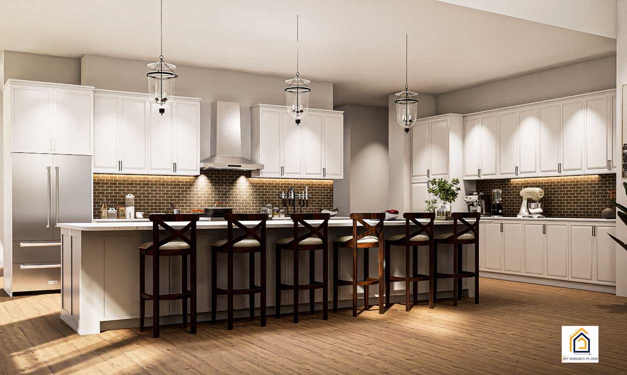 The kitchen in the Table Rock Barndominium is built around a large island that provides seating, food prep space, and a natural gathering point for family and guests. The island creates a clear separation between the kitchen and the dining area while still keeping the space open.